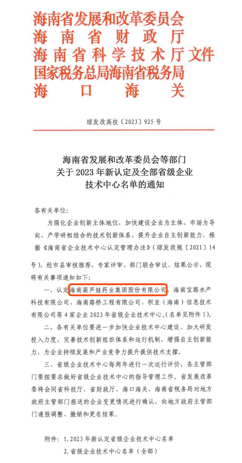 近日,海南省发改委等多部门联合公布了《关于2023年新认定及全部省级企业技术中心名单的通知》,其中,海南z6mg·人生就是博药业集团股份有限公司成功通过评审,被认定为省级企业技术中心,是本次获批的4家企业之一。